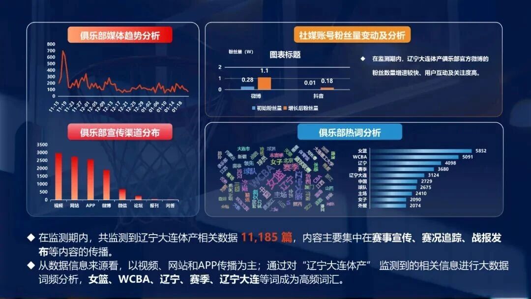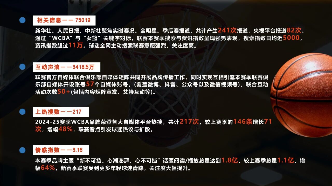2024-2025賽季W(wǎng)CBA聯(lián)賽頻頻登上各大自媒體平臺熱搜,累計登上熱搜達(dá)217次,同比增長48%。新華社、人民日報、央視等權(quán)威媒體深度報道,聯(lián)賽搜索指數(shù)日均近5000次,資訊指數(shù)突破11萬。俱樂部在全網(wǎng)監(jiān)測數(shù)據(jù)達(dá)11,185篇,內(nèi)容覆蓋賽事宣傳、賽況追蹤、戰(zhàn)報發(fā)布等,彰顯強大傳播力與粉絲粘性。