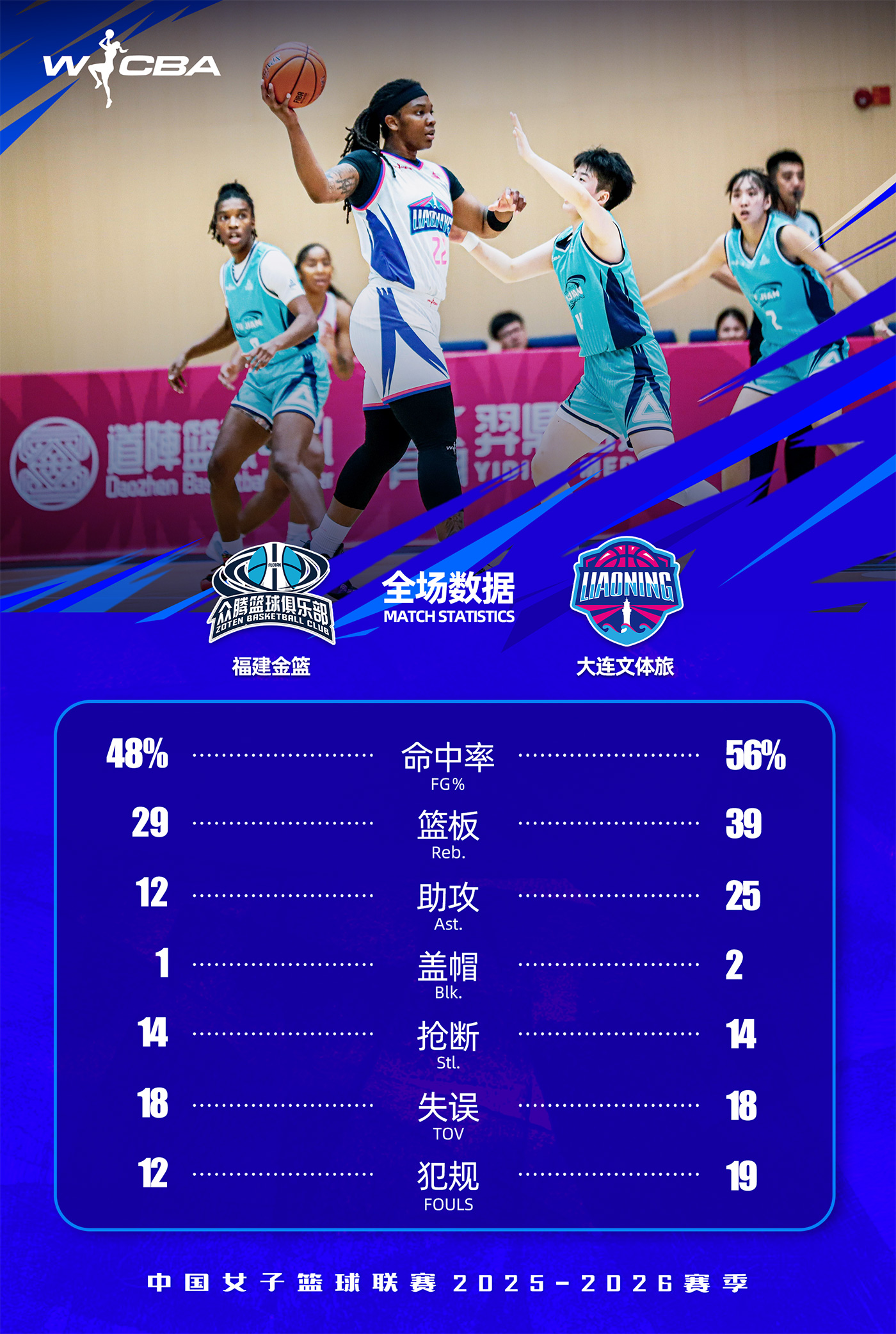 北京時(shí)間2025年12月29日19時(shí)30分,2025-26賽季W(wǎng)CBA常規(guī)賽第十輪展開較量,大連文體旅女籃客場(chǎng)對(duì)陣福建金籃女籃。全場(chǎng)比賽,大連文體旅女籃多點(diǎn)開花,始終掌握?qǐng)錾现鲃?dòng),最終98:82戰(zhàn)勝福建金籃女籃。