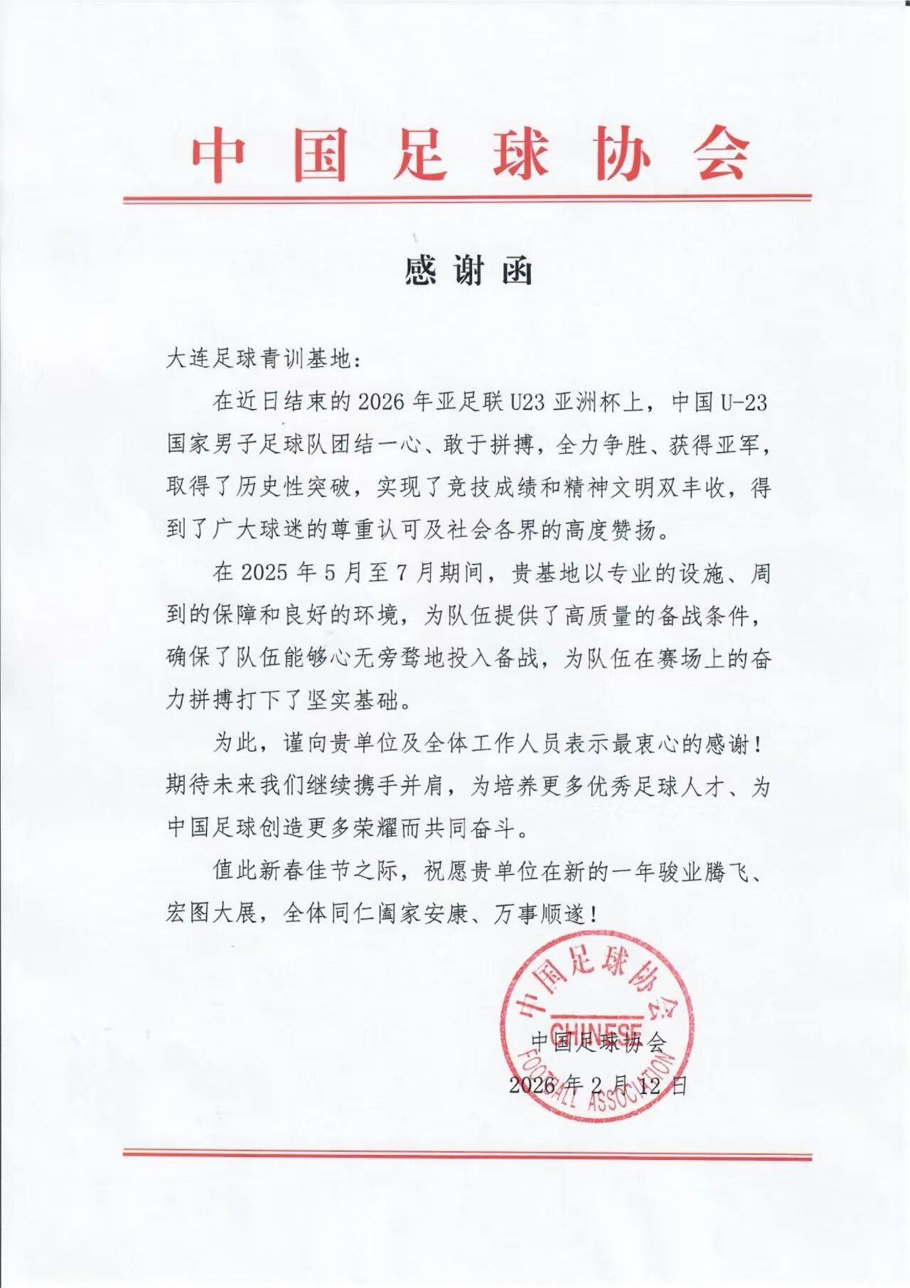 2026年2月12日,中國足協(xié)致函大連足球青訓基地,對基地在2025年5月至7月期間為中國U-23男足提供的專業(yè)設施、周到保障、良好環(huán)境等高質(zhì)量備戰(zhàn)條件給予高度認可。