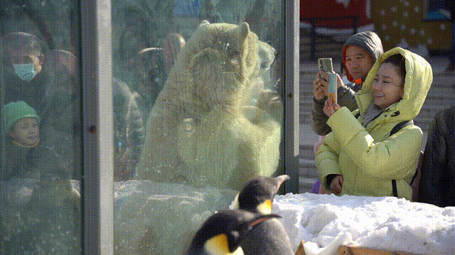 節(jié)日期間,憨態(tài)可掬的北極熊“團子”、“圓子”與南極帝企鵝們早早就出門迎客,與游客一起慶祝佳節(jié)。