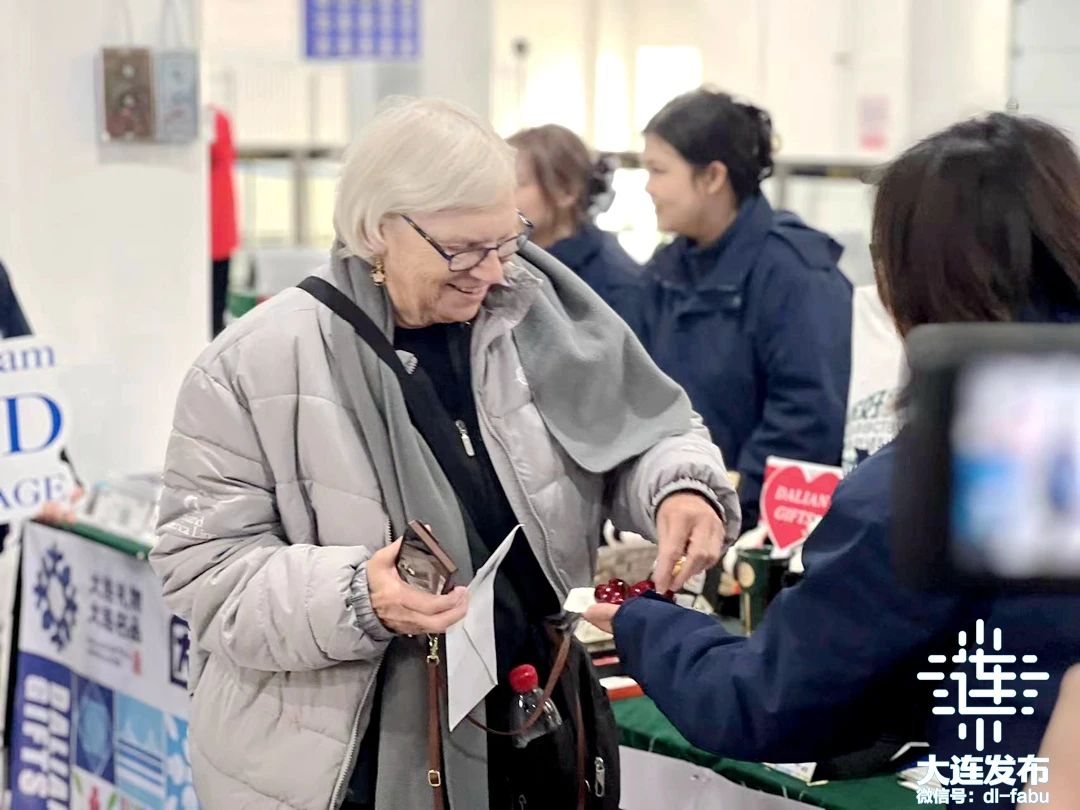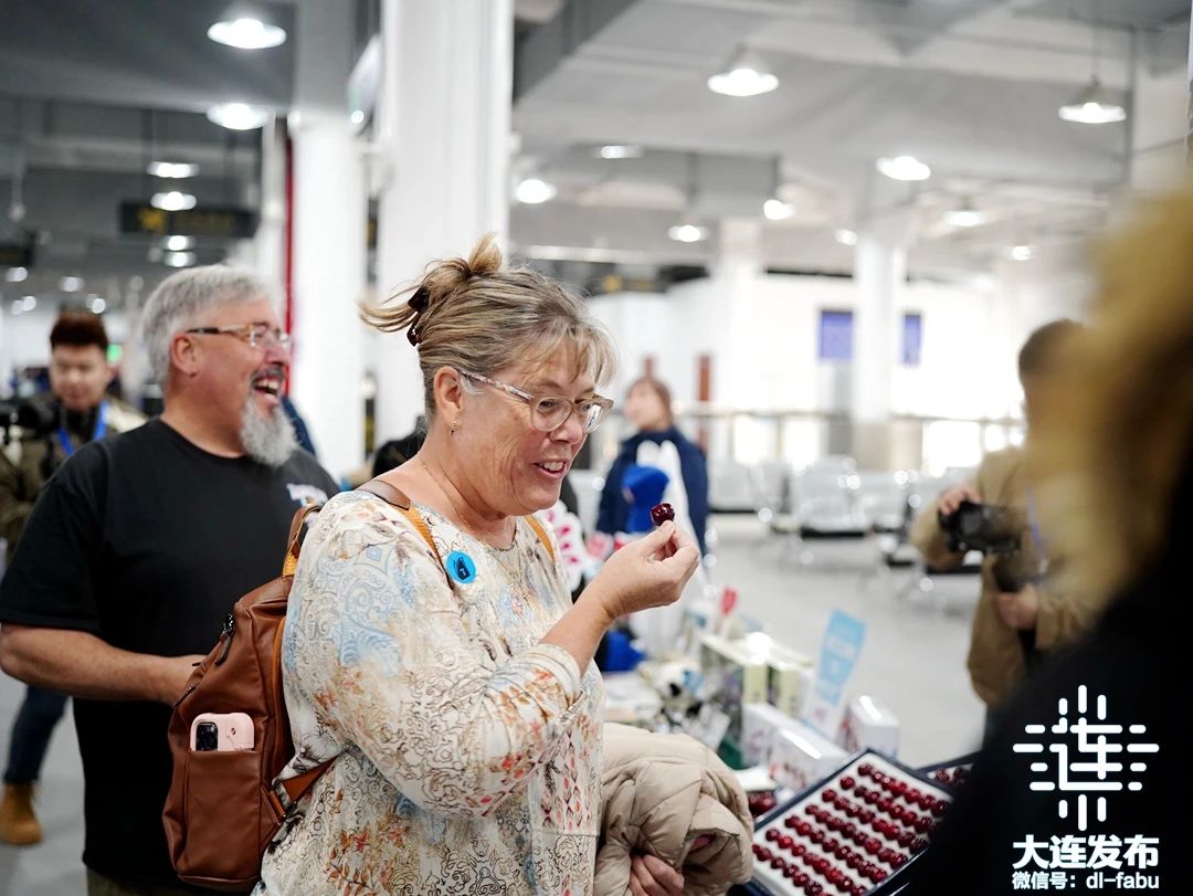 現(xiàn)場,身著傳統(tǒng)服飾的民樂團現(xiàn)場演奏《茉莉花》等名曲縈繞回響、聲聲入耳;整齊置放在迎客大廳售賣專區(qū)代表大連地工特色和文創(chuàng)特點的“大連禮物·大連名品”商品琳瑯滿目、特色鮮明;普蘭店區(qū)四平街道帶來的新鮮大櫻桃深受喜愛,游客們現(xiàn)場試吃、贊不絕口。