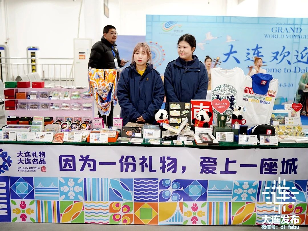 在“大連禮物·大連名品”售賣專區(qū),大連地標建筑的冰箱貼、大連貝雕、印有大連字樣的T恤、明信片、立體書等大連特色的文創(chuàng)商品整齊擺放,讓許多外國游客愛不釋手。