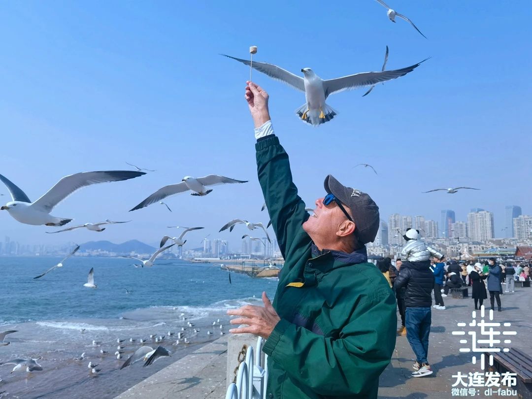 游客麥克買了一根烤腸,親自體驗喂海鷗。每次海鷗叼走手中的烤腸,麥克都異常興奮喊道: