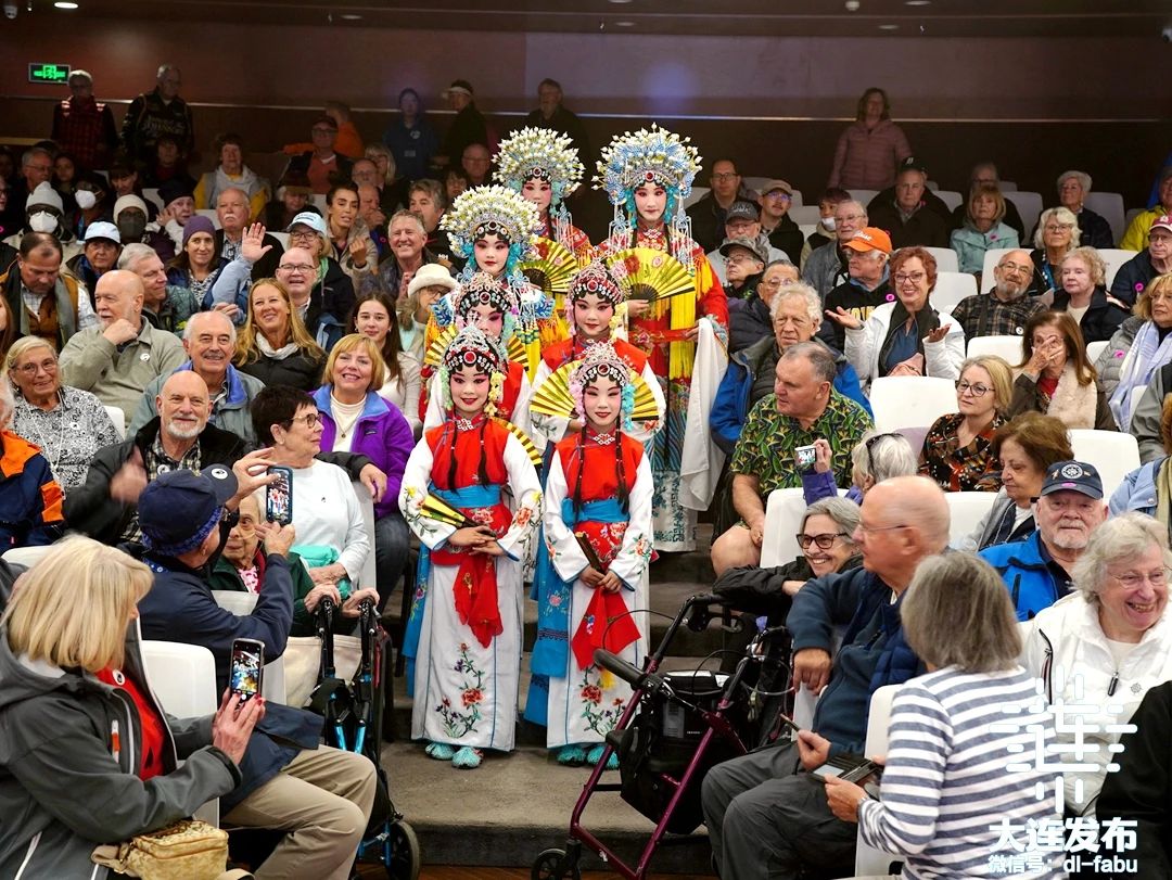 為了讓游客們沉浸式體驗中華優(yōu)秀傳統(tǒng)文化,大連城市音樂館特別準備了一場約30分鐘的演出。民樂合奏《象王行》《財神到》將中國民族樂器的魅力展現(xiàn)得淋漓盡致;中國舞《豆蔻梢頭》古典曼妙,贏得滿堂彩;由孩子們表演的聲樂合唱《福氣要來到》朝氣蓬勃;京劇表演《賣水》《梨花頌》粉墨登場,讓游客們震撼不已。演出結束后,游客們爭相與演員合影,將這快樂的記憶定格、封存。