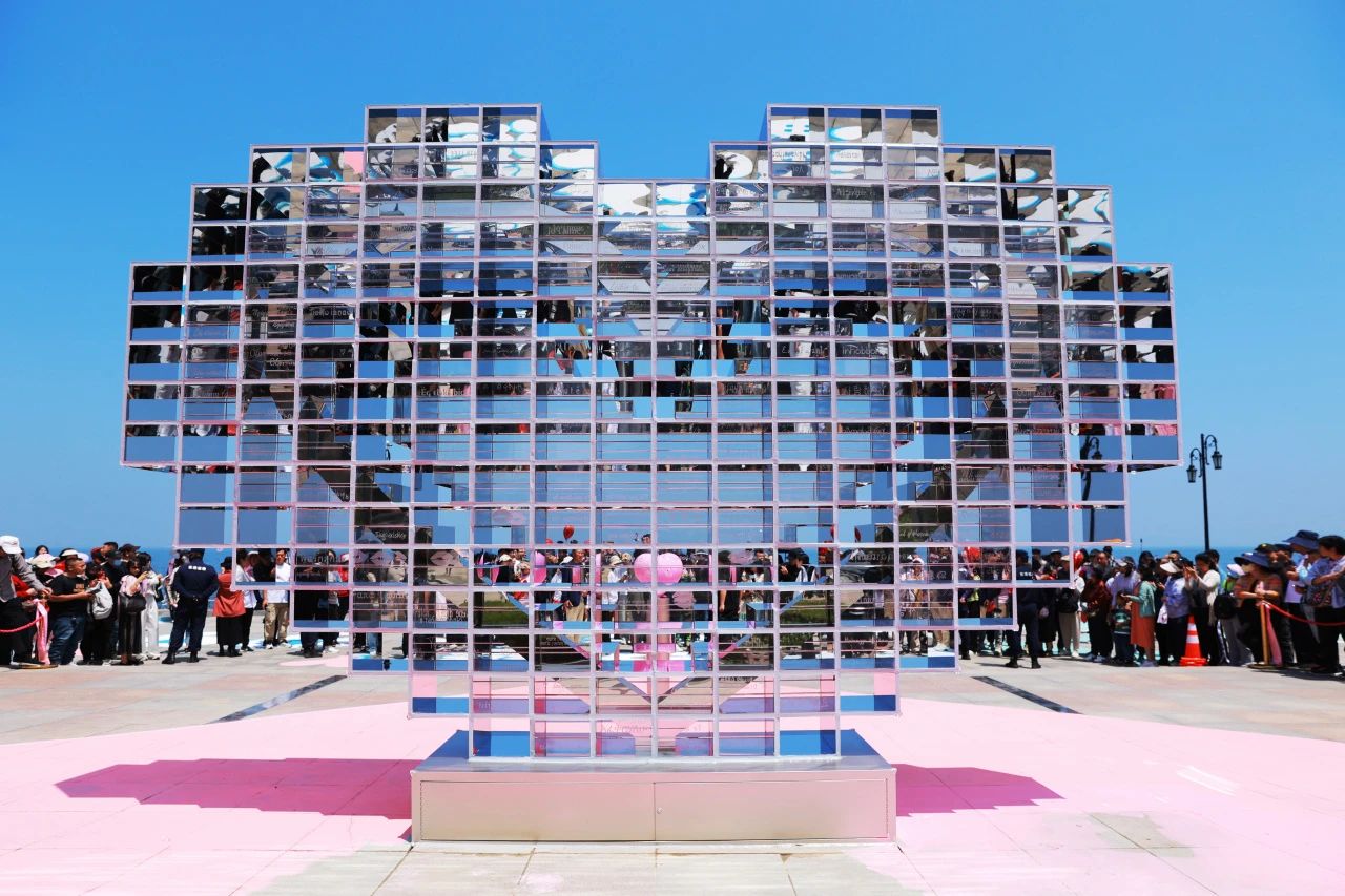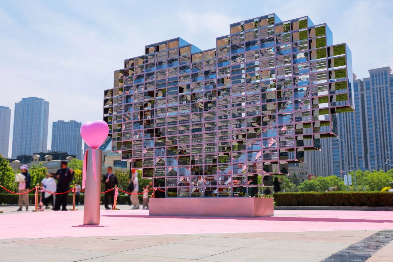 這座中國(guó)“愛(ài)墻”以中法建交60周年為契機(jī),借鑒了法國(guó)“愛(ài)墻”的建設(shè)立意,通過(guò)打造心形愛(ài)墻景觀(guān),充分體現(xiàn)中法文化交流和友誼源遠(yuǎn)流長(zhǎng)的底蘊(yùn),進(jìn)一步豐富大連東港旅游度假區(qū)文化內(nèi)涵。中國(guó)“愛(ài)墻”以心形鋼結(jié)構(gòu)主框?yàn)榛A(chǔ),采用若干井字形不銹鋼骨架將心形主框緊緊包裹,8K鏡面鋼板交互穿插,結(jié)合多棱鏡原理,形成萬(wàn)花筒效應(yīng),520塊特制透明水晶磚鑲嵌其中,磚體以?xún)?nèi)雕工藝用100種語(yǔ)言、230種字體書(shū)寫(xiě)“我愛(ài)你”,寓意愛(ài)意純澈、愛(ài)無(wú)國(guó)界,連接你我、傳遞幸福。夜晚,內(nèi)置的百米燈帶將會(huì)用色彩斑斕的燈光將水晶磚體點(diǎn)亮,與東港的夜色交相輝映,向市民游客呈現(xiàn)一場(chǎng)流光溢彩、美輪美奐的視覺(jué)盛宴?!皭?ài)墻”前側(cè)的心形打卡裝置,通過(guò)獨(dú)特的感應(yīng)模式與墻體互動(dòng),市民游客可以與墻互動(dòng)、拍照留念。