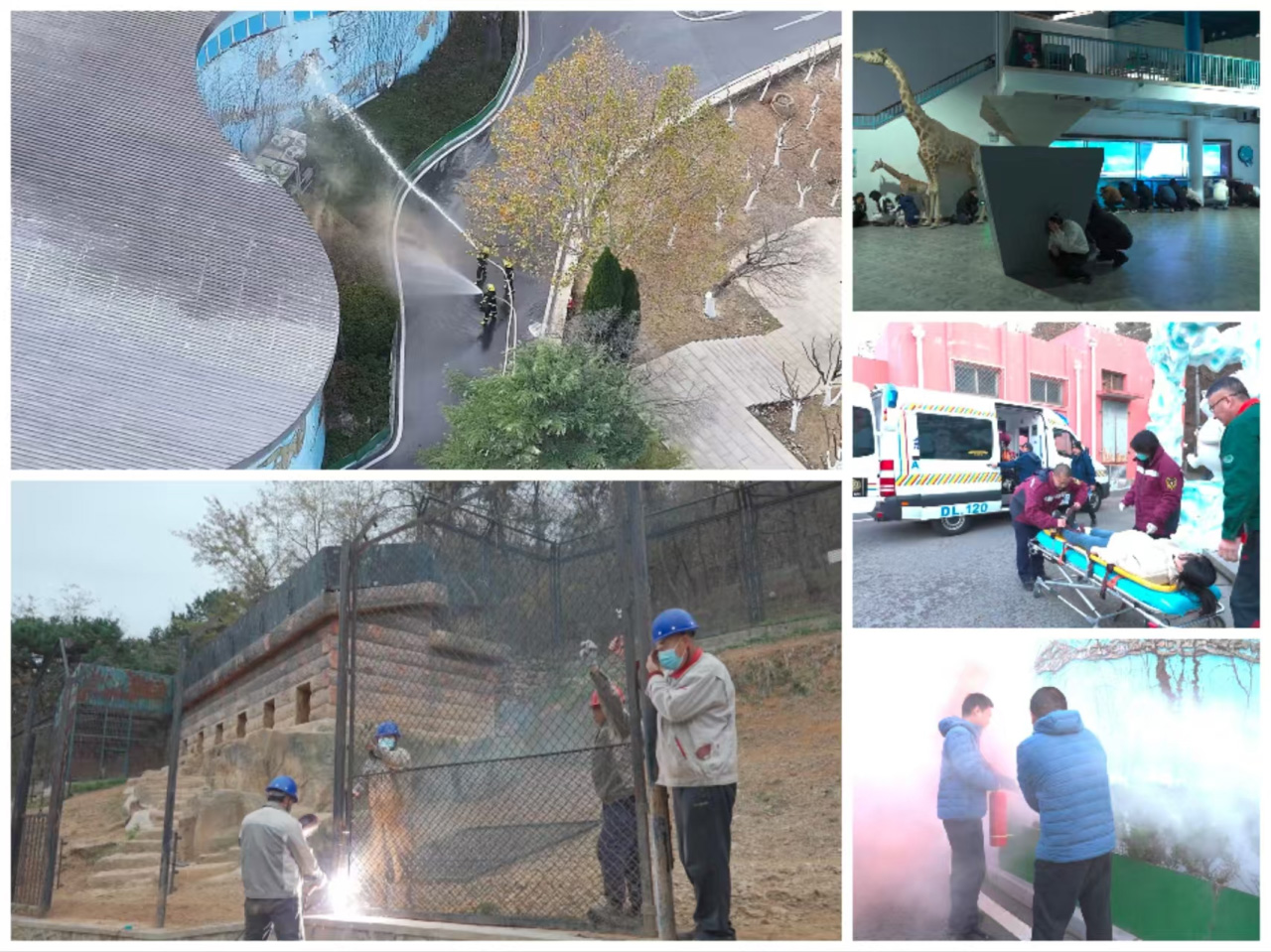 模擬地震災害應急處置環(huán)節(jié),工作人員迅速組織游客有序疏散,及時妥善安置傷員。地震導致場館內電路起火,工作人員在自行撲救無效后,立即撥打119報警。消防人員到場了解火情后,設置噴水槍陣,降低建筑周圍溫度,有效控制火情,集中消防力量完成滅火。災后,工作人員仔細檢查、修復因災受損的動物籠舍并迅速轉移動物,根據(jù)受損情況制定修繕方案。