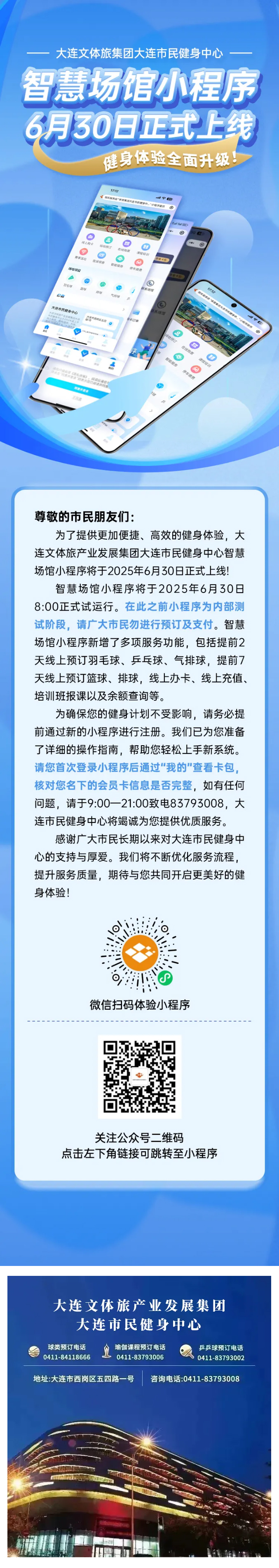 大連市民健身中心智慧場(chǎng)館小程序6月30日正式上線 健身體驗(yàn)全面升級(jí)!